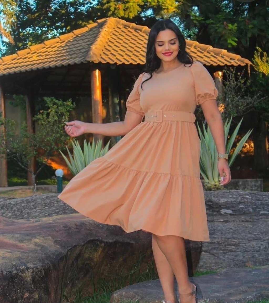 VESTIDO MIDI CREPINHO COM CINTO BEGE